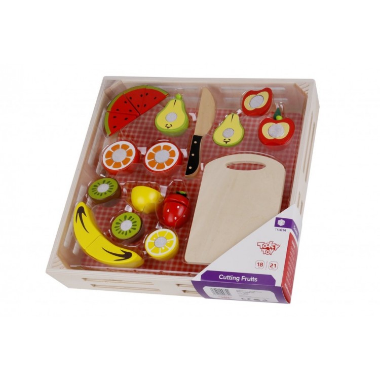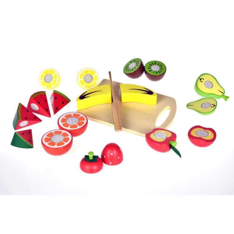 Με έντονα χρώματα και όμορφα σχέδια, το ξύλινο σετ φρούτων κοπής βοηθάει το παιδί να εξοικειωθεί με τα φρούτα , τα σχήματα και τα χρώματα και να αναπτύξει καλύτερο συντονισμό κινήσεων. Συμπεριλαμβάνεται και ξύλο κοπής και δίσκος για την τοποθέτηση των φρούτων. Κατάλληλο για παιδιά ηλικίας άνω των 18 μηνών. Διαστάσεις: 40 x 35 x 5 εκ.