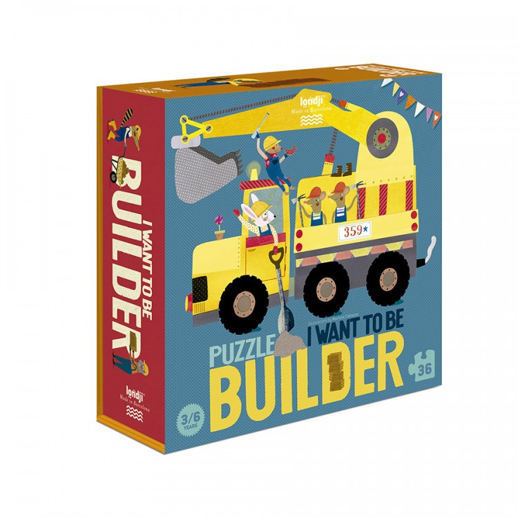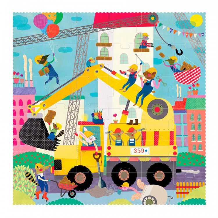 Ένας εκσκαφέας, ένας μεγάλος γερανός, και πολλοί μικροί χτίστες. Ένα υπέροχο παζλ 36 κομματιών για όσους αγαπούν τις κατασκευές. Κατασκευασμένο από 100% ανακυκλωμένα υλικά και σχεδιασμένο στην Βαρκελώνη από την ισπανική εταιρία Londji. Διαστάσεις παζλ: 47 x 47 εκ.