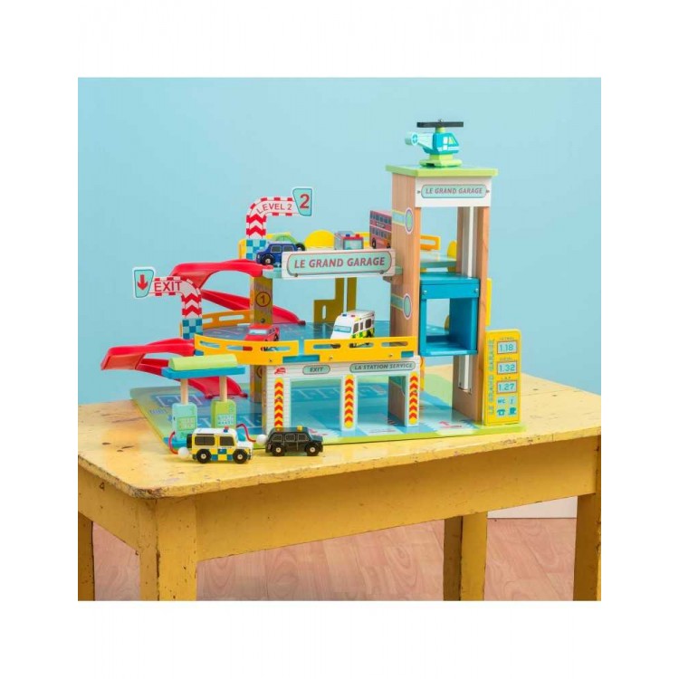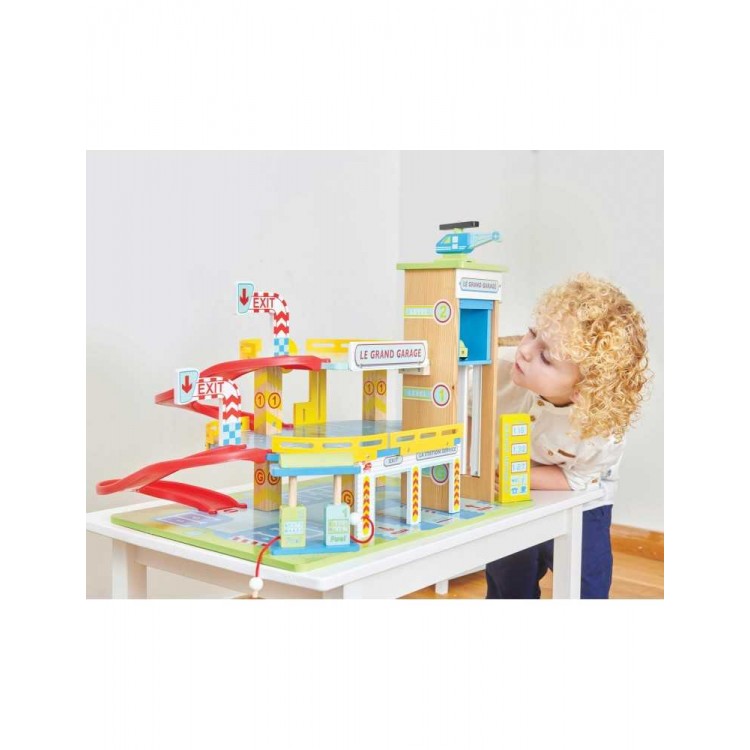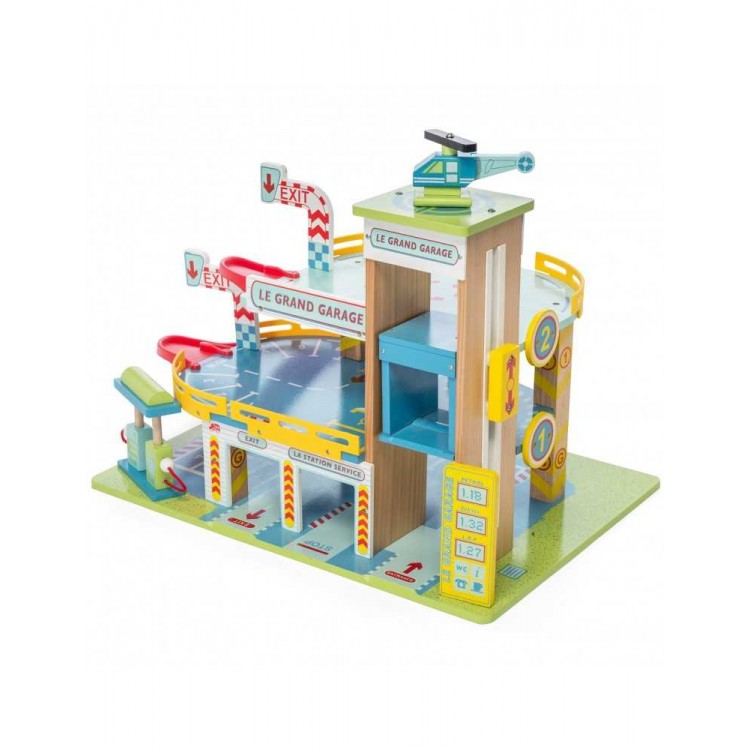 Το τριώροφο γκαράζ LE GRAND με δύο σπιράλ ράμπες, ελικόπτερο, αυτοκίνητο και αντλία βενζίνης. Διαστάσεις:55x40x42cm
