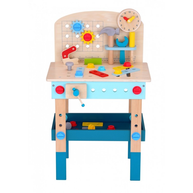 Ο ξύλινος πάγκος με εργαλεία είναι ένα παιχνίδι πολλαπλών δραστηριοτήτων για ατελείωτες ώρες μαστορέματος! Απευθύνεται σε παιδιά άνω των 3 ετών και περιλαμβάνει μια ποικίλα από εργαλεία, γρανάζια και σφηνώματα σε έντονα χρώματα που μαγνητίζουν την προσοχή. Ο ξύλινος πάγκος με εργαλεία βοηθά στην ανάπτυξη των λεπτών κινητικών δεξιοτήτων, της λογικής σκέψης, της αντιστοιχίας σχημάτων και αντικειμένων, της φαντασίας, καθώς και στον συντονισμό χεριού-ματιών. Απαιτείται συναρμολόγηση. 40x26x64.5 εκ.
